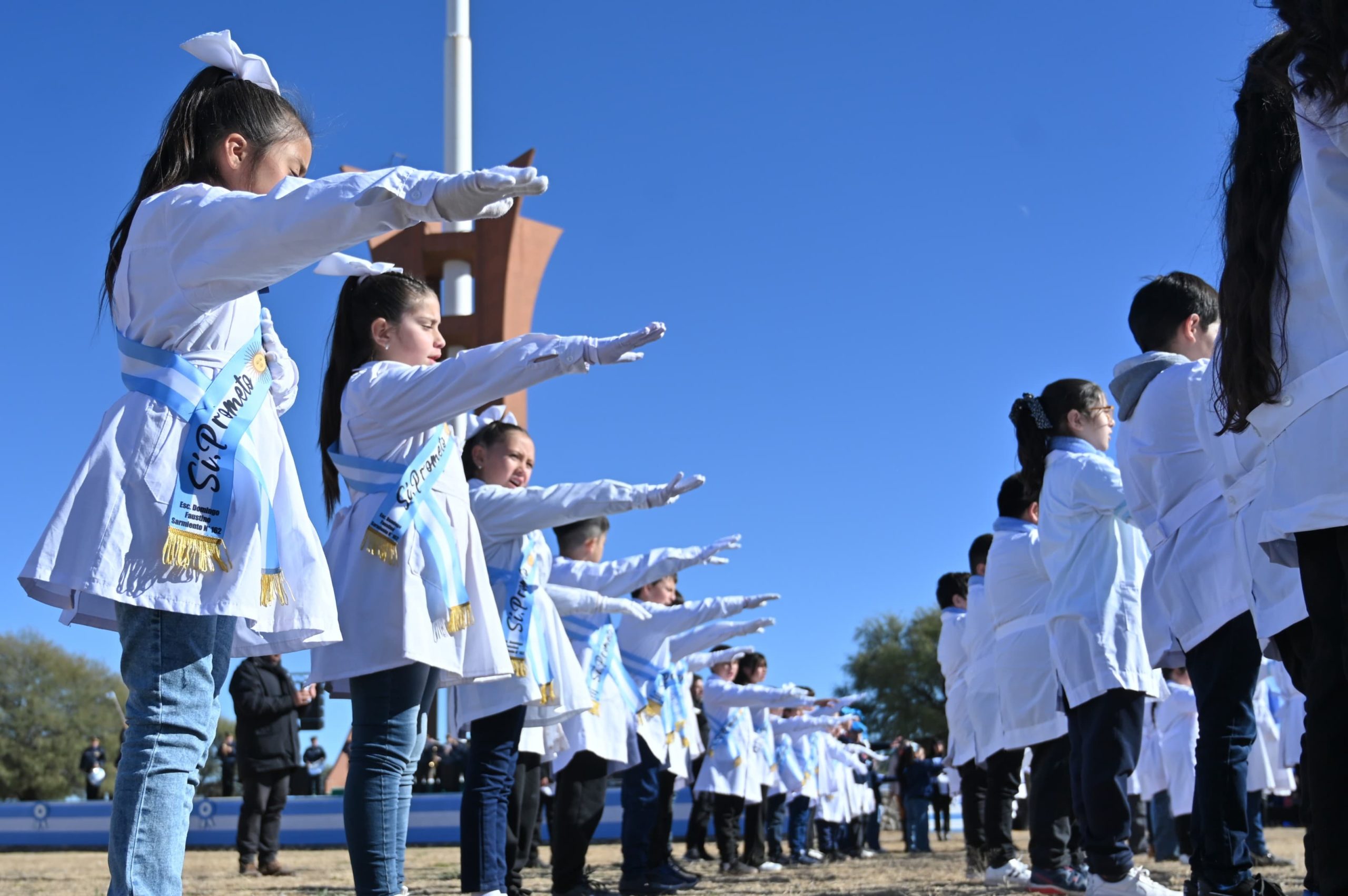 “¿Prometen hacer todo lo que esté a su medida, a su fuerza, para que la Bandera Argentina flamee por siempre en los mástiles de nuestras instituciones, para que el honor sea su aliento, la gloria su aureola y la justicia su empresa?”, preguntó Lucero, a lo que los alumnos con sus manos en el pecho respondieron: “!Sí, prometo!”.
